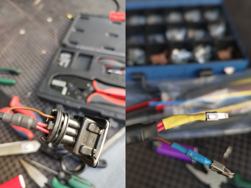 Das Kabel war glücklicherweise noch lang genug, sodass ich es kürzen u. die Enden mit JPT Kontakten neu crimpen sowie die beiden kurzen Massekabel an der Abschirmung neu herstellen konnte.