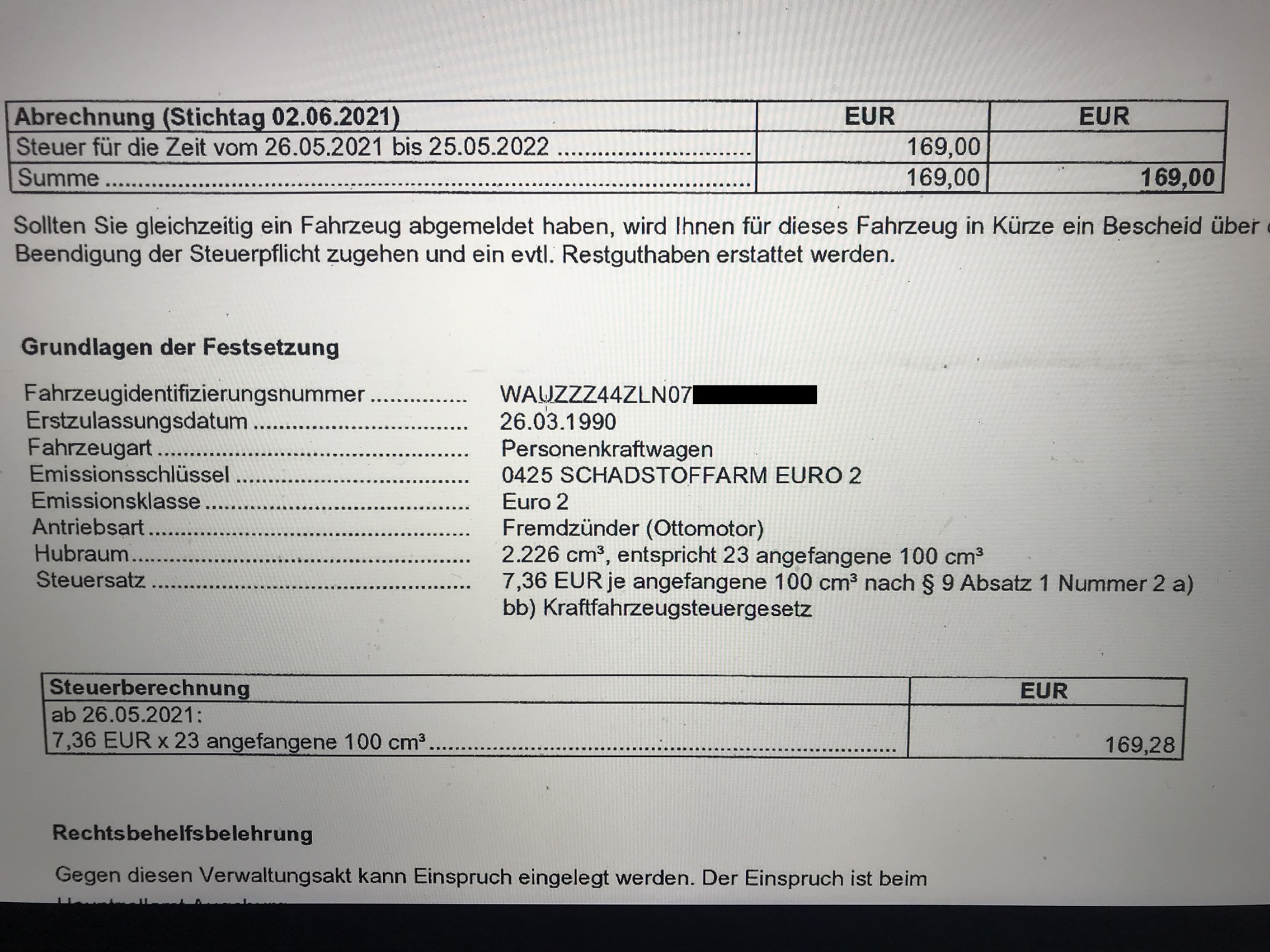 Ich habe meinen Audi 200 20v (3b) auf "H" umgemeldet. Eingetragen ist noch der Kaltlaufregler für die Euro 2 Abgasnorm. Muss ich nun die 191,73 Euro Zahlen oder die 169 € für Euro 2??