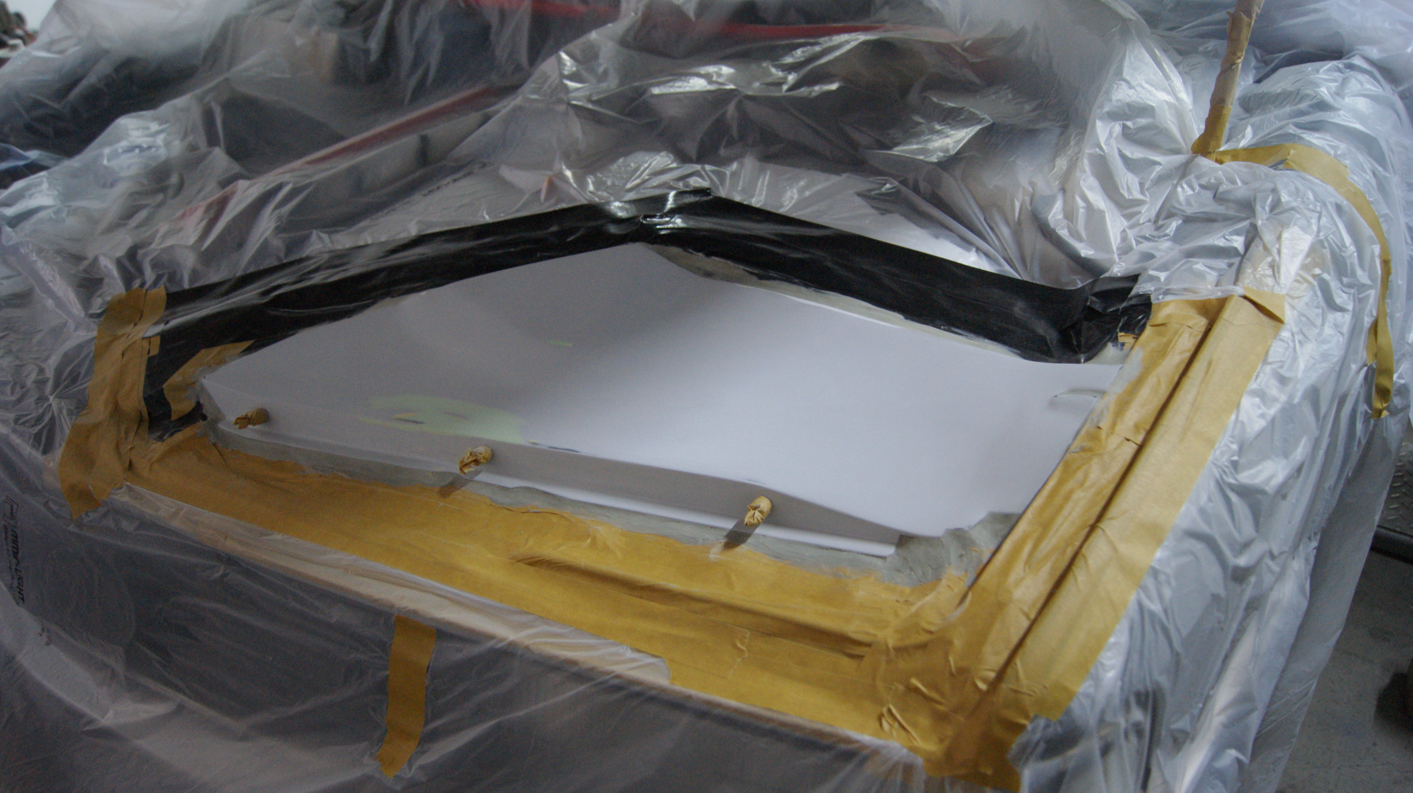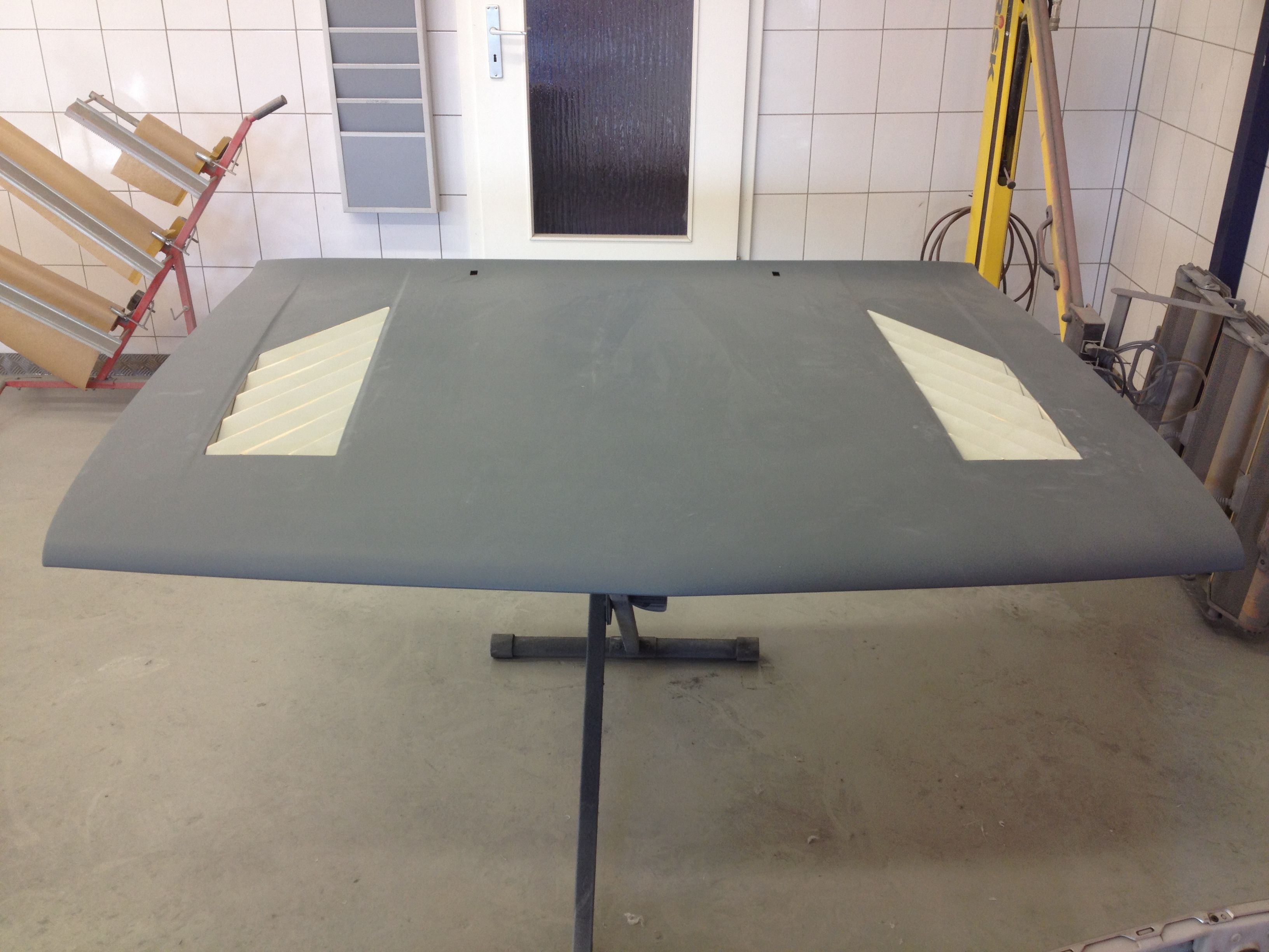 Die Motorhaube des Audi 200 wird schon aus GFK gefertigt ohne Schlitze ohne die vorderen Befestigungspunkte hinten sind die Gewinde eingearbeitet für die Scharniere.