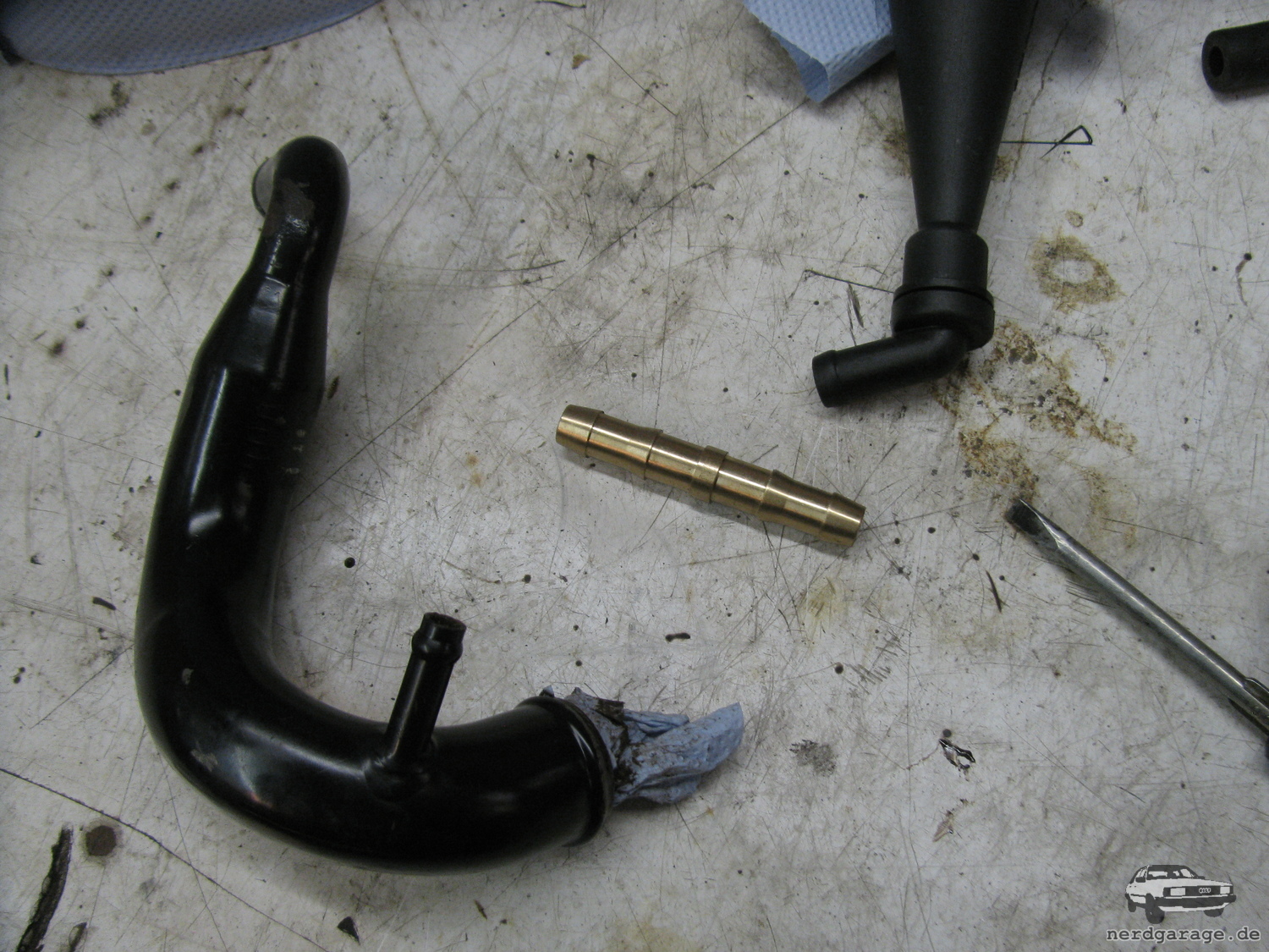 Abgesehen davon hatte ich bei meinem NF den kaugummi-entlüftungsschlauch bereits durch das Metall-rohr 054103227A ersetzt, das hier auch leicht modifiziert weiterverwendet wird.