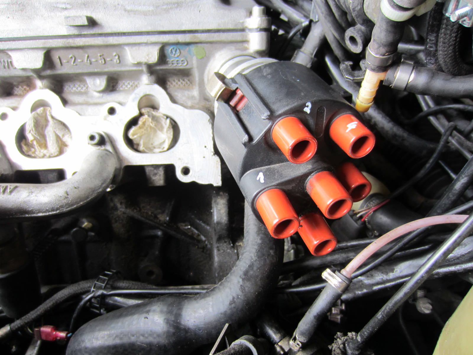 Hier mal ein Bild aus meinem 200er 20V mit dem 3B-Motor. Da zeigt der Verteilerfinger nach vorne zu Stoßstange. Steht so auf dem ersten Zylinder.