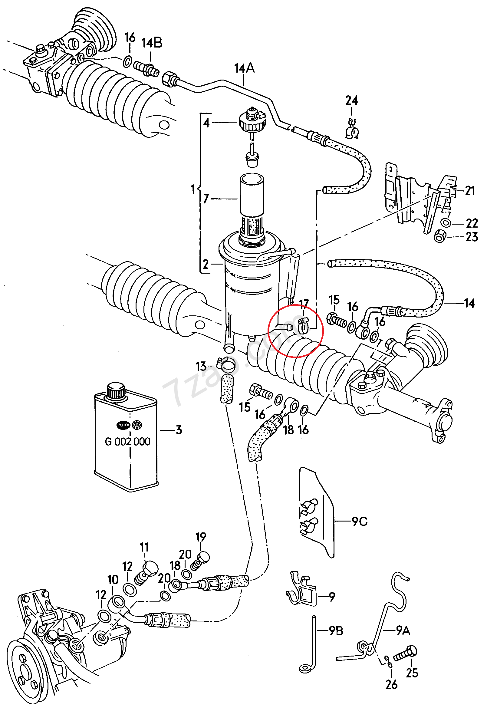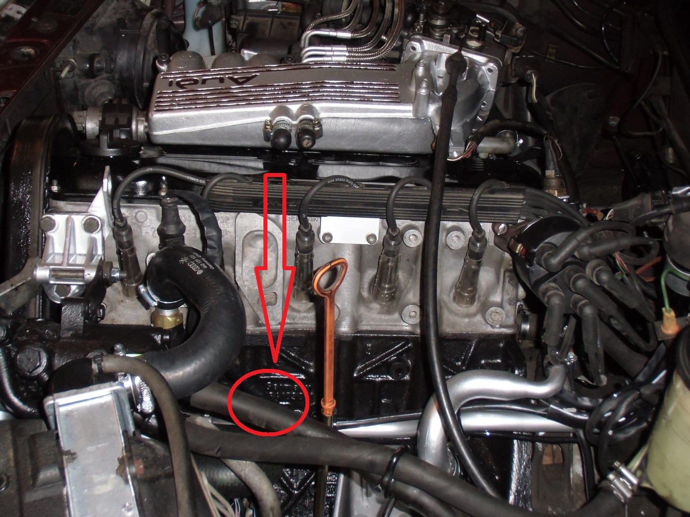 Mich würde interessieren wo konkret ich den reinbaue. Wegen besserer Erreichbarkeit falls mal was ist, wollte ich das Ding in die Leitung von der Pumpe zum Lenkgetriebe, direkt hinter der Pumpe anbringen. Der rote Kreis im Bild.