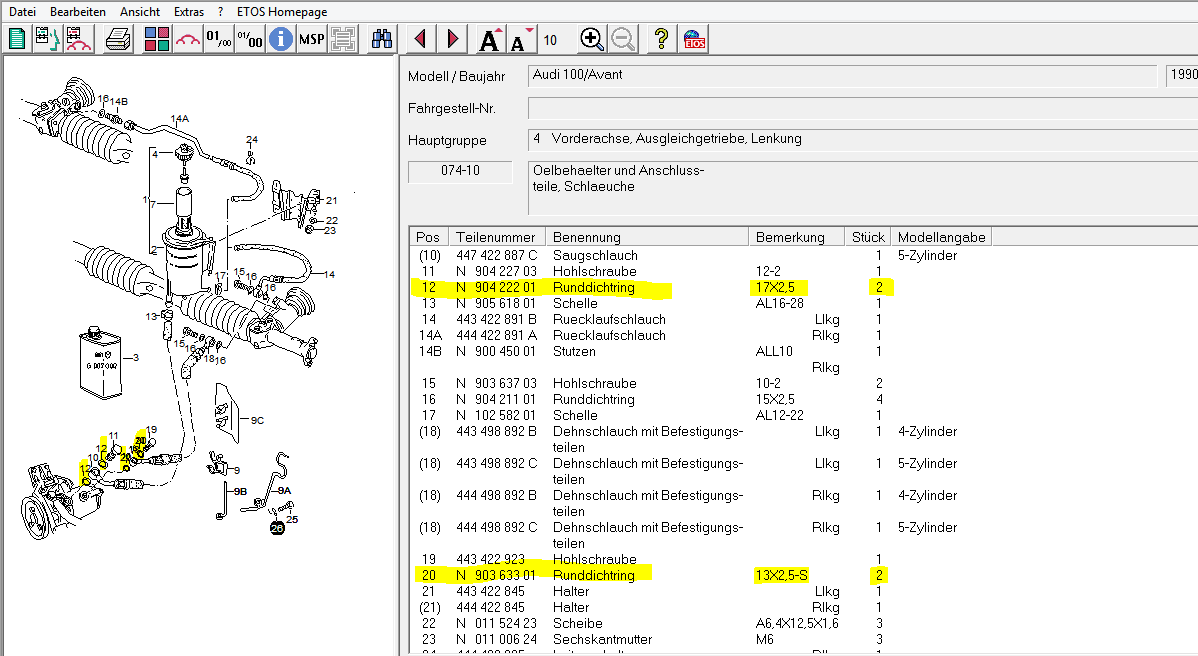 2x den Dichtring "N 903 633 01" am Dehnschlauch zum Lenkgetriebe, Listenpreis: 3,09€/Stück incl. 19% Mwst., noch lieferbar 2x den Dichtring "N 904 054 01" am Hochdruckschlauch zum Druckspeicher Bremse, Listenpreis: 3,27€/Stück incl. 19% Mwst., noch lieferbar