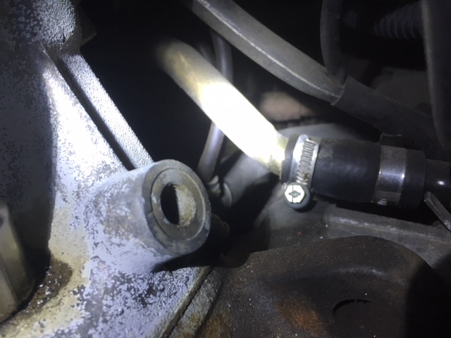 Verbindungsstück Vom gebogenen Metallrohr zum Metallrohr hinterm Zylinderkopf (hell angestrahlt)