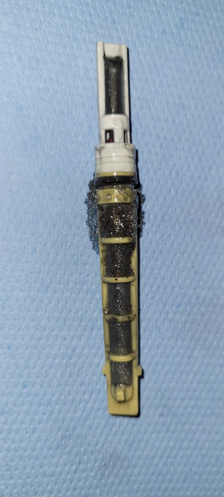 Ich glaube auch nicht, dass großartig Späne bis hinter die Drossel gekommen sind. Das Sieb der Drossel ist auch nicht beschädigt und was sich dort abgelagert hat ist wohl mit "metallischem Abrieb" besser beschrieben als mit Spänen.