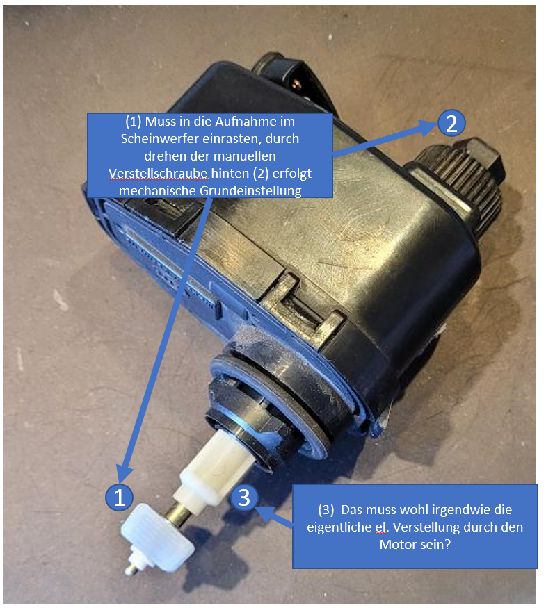 Während ich das schreibe (bin die nächsten Tage nicht am Auto) - kann ich mir helfen indem ich das Leuchtmittel heraus nehme? Kann ich dann die Aufnahme (meine Nr. 1 auf dem Bild oben) durch das Loch für das Leuchtmittel mit dem Finger führen oder (Endoskok) die Position prüfen? Oder muss man den Motor mit Teil 1 unten in einer ganz bestimmten Position einsetzen oder die manuelle Verstellung ganz auf Anschlag rein oder raus drehen? Ist ja sonst irgendwie ein Glücksspiel, dass der Winkel inkl. der Drehung beim Einsetzen genau passt und es einrastet...