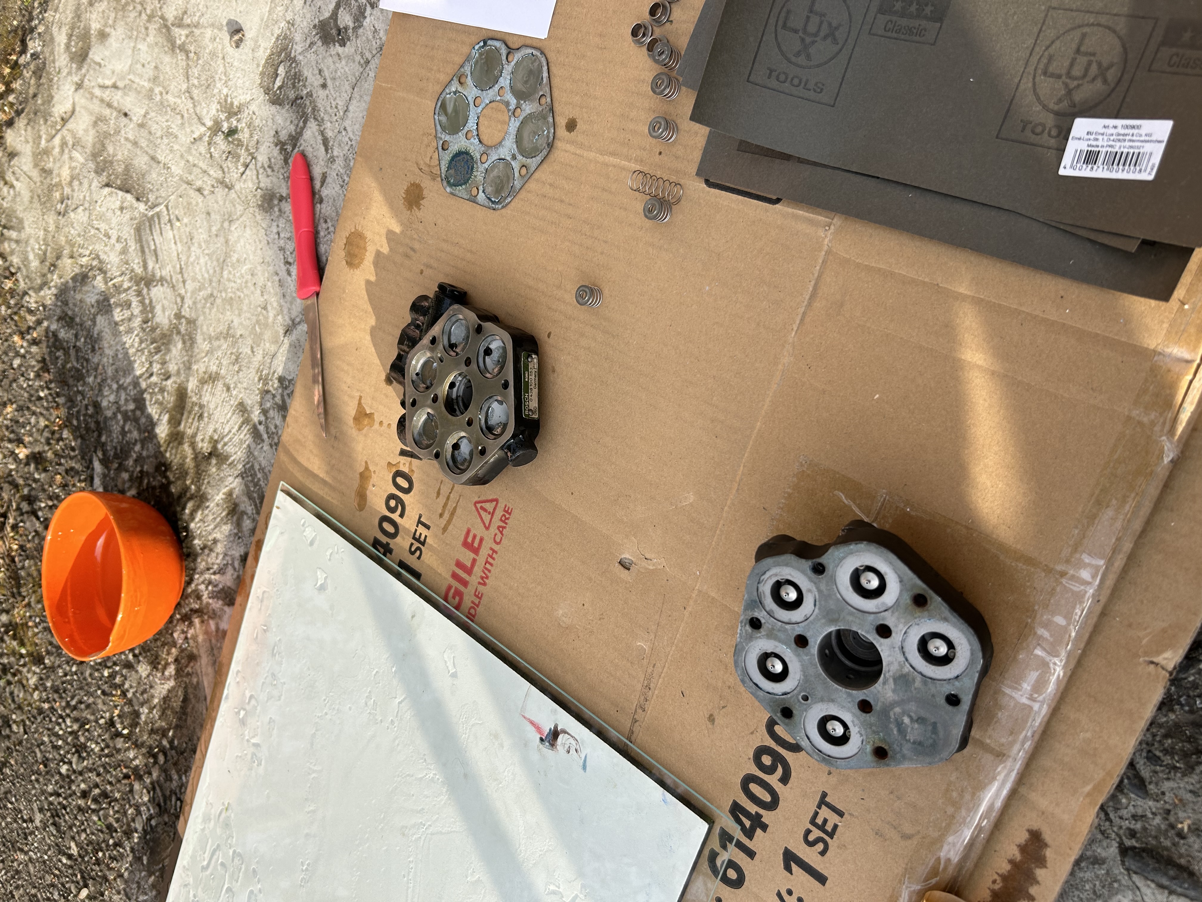 Nun kam der Dichtungssatz von T&S Technik. Habe die beiden MT Hälften mit dem Schleifpapier vorsichtig mit einer Glasplatte als Untergrund geschliffen. Ich weiß nicht wieviel ich abnehmen darf deshalb habe ich es nicht zu sehr geschliffen, an den Rändern ist es schön glatt geworden aber mittig von den MT Hälften ist noch der „dreck“ bzw. Reste des Dichtungsmittel eingelassen. Mit einem Ultraschallbad würde man den dreck sicher aus den Poren bekommen, geschliffen auch aber dann müsste man einiges runterschleifen. Denke aber das es so auch passen sollte, beide Hälften sind glatt und gerade.