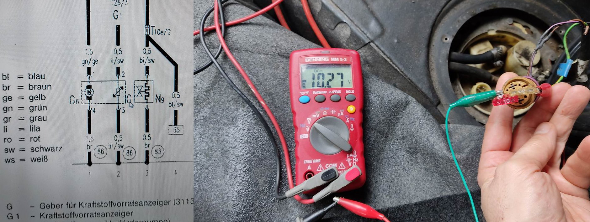 Für die Messungen bin ich hinten an den abgezogenen Stecker des Tankgebers gegangen und habe zwischen dem Kabel lila/schwarz gegen Masse (br/schw) direkt am Widerstand gemessen.