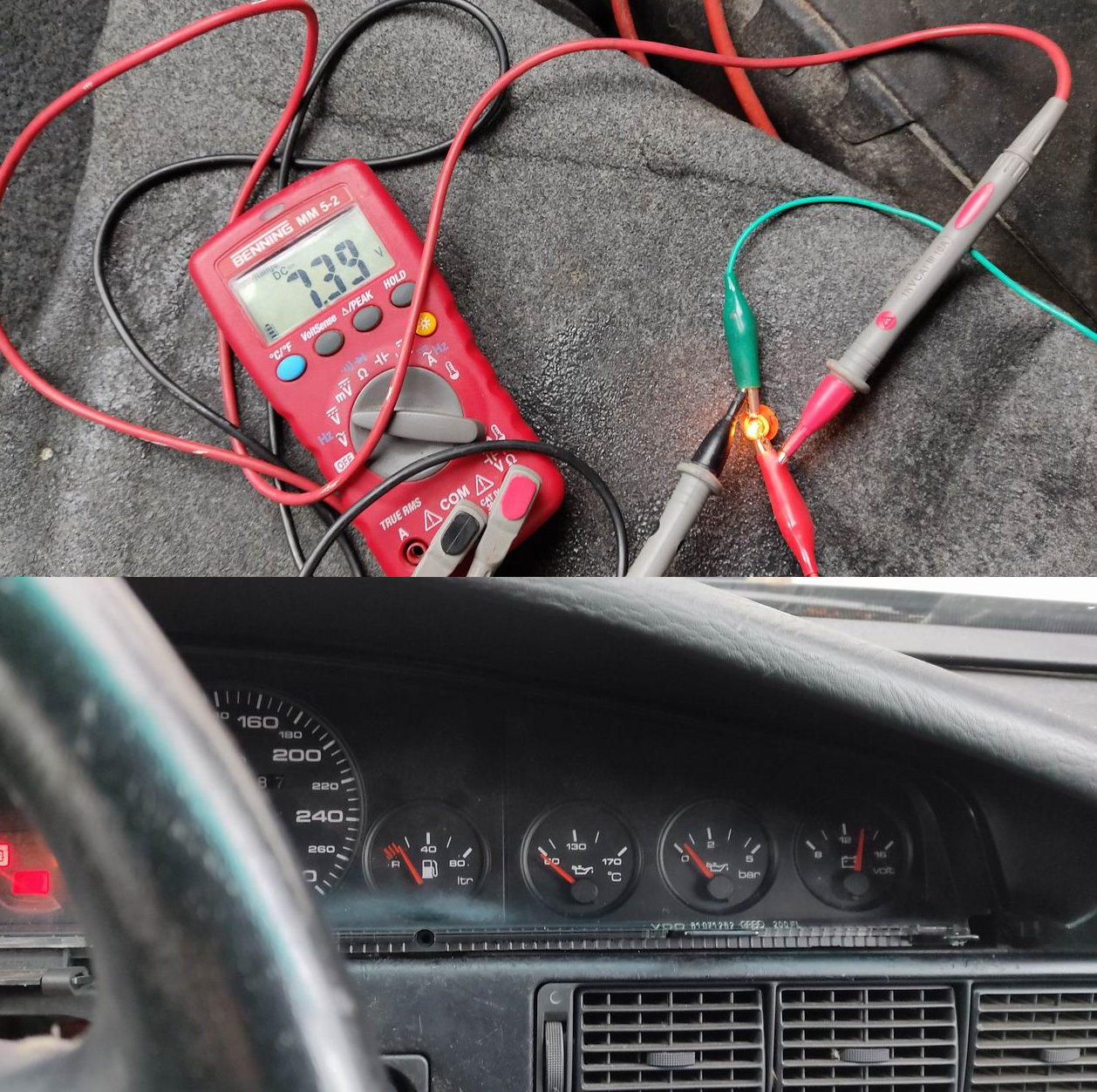 ( die Tankuhr funktioniert nach dem Hitzdrahtsystem: Der Strom fließt durch einen dünnen Draht, der um den freien Schenkel eines U-förmigen Bimetalls gewickelt ist. Je stärker der Strom, um so mehr wird das Bimetall erhitzt und um so mehr verbiegt es sich. Diese Bewegung wird über eine Kunststoffgabel auf den Zeiger übertragen - fertig. Wenn man jetzt unvorsichtigerweise die Tankuhr direkt an Masse legt ( also nicht über den Restwiderstand des Tankgebers von ca. 38 Ohm ), dann fließt ein so starker Strom, dass das Bimetall in der Tankuhr verformt wird und der Zeiger dadurch selbst im stromlosen Zustand bereits irgendwo auf der Skala steht, wenn er nicht sogar aus der Gabel herausspringt und dann blockiert im Instrument liegt. Das gilt übrigens auch für die Temperaturanzeige ! Abhilfe: Instrument zerlegen und Bimetall vorsichtig zurückbiegen, bis es wieder in der ursprünglichen (Null)Lage steht. )