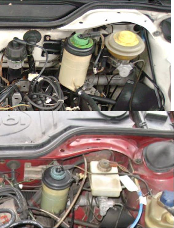 in Deinem Motroraum sollte es wie in der unteren Bildhälfte mit dem eckigen Bremsflüssigkeitsbehälter aussehen.