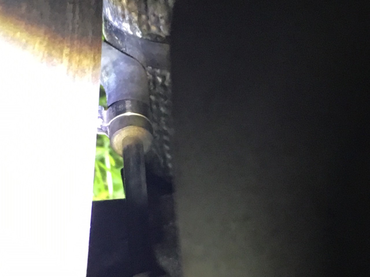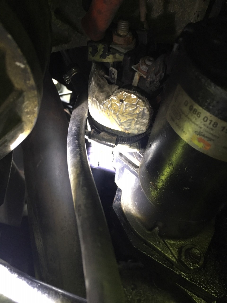 Der Schlauch läuft zw. Hosenrohr und Anlasser nach oben in ein Metallröhrchen welches fühlbar unter dem Auslasskrümmer verschwindet: