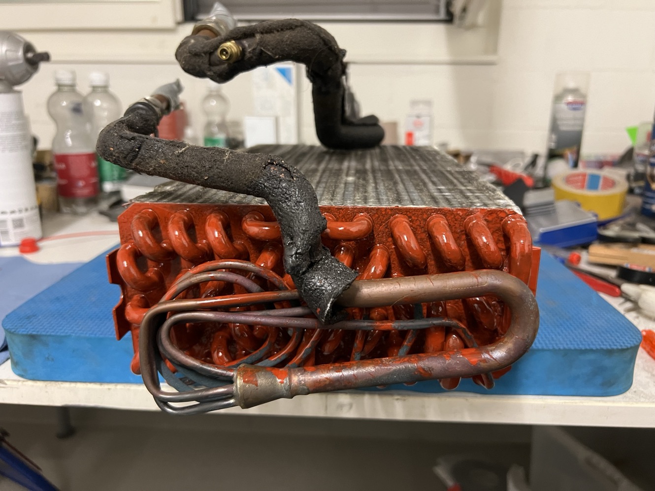 Wie ich in mein Vorstellungspost erwähnt habe, war die Klimaanlage in mein 20V in sehr schlechtem Zustand. Der Kompressor hat grünes Lecksucheöl aus jeden Schlitz und Loch ausgekotzt. Der Kondensator hatte viele zerdrückte Lamellen, im Expansionsventil war der "schwarze Tot" klar zu sehen. Nicht gut, gar nicht gut.