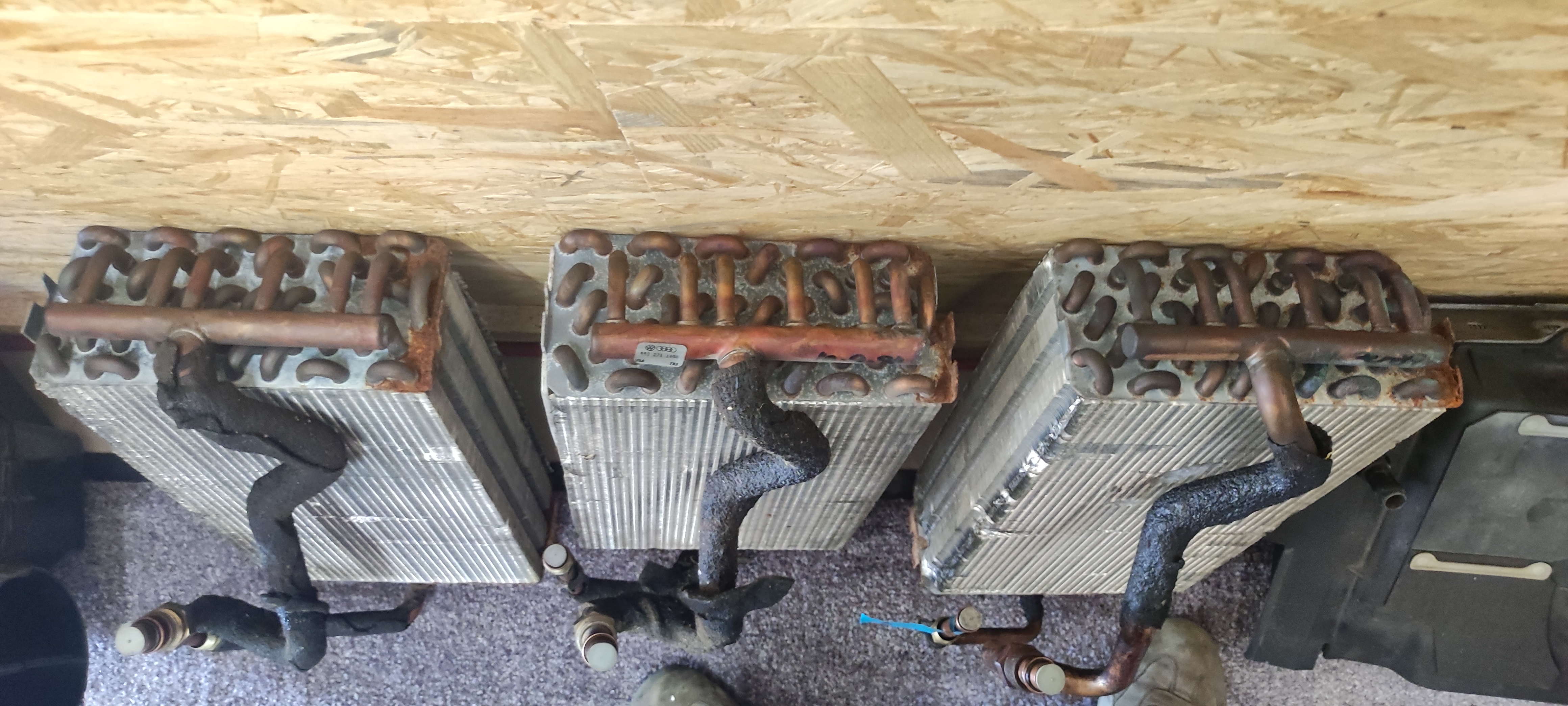 Die beide Klappen vom Verdampferkasten waren korrodiert und vom Dichtungs-Schaum war nichts mehr da (war nur noch Pulver). Der ganze Kasten war übrigens eine dreckige Horrorshow (ich fand sogar eine tote Maus und ein halbes Wald an Blätter etc. im Wasserkasten von Links bis Rechts